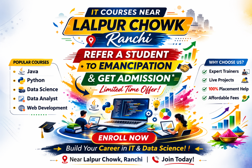 If you are searching for IT courses near Lalpur Chowk, Ranchi, or want to refer a student for admission, Emancipation Edutech Private Limited is a smart and reliable choice. With practical training, in-demand courses, and a student-centric approach, Emancipation helps learners transform their careers through technology.