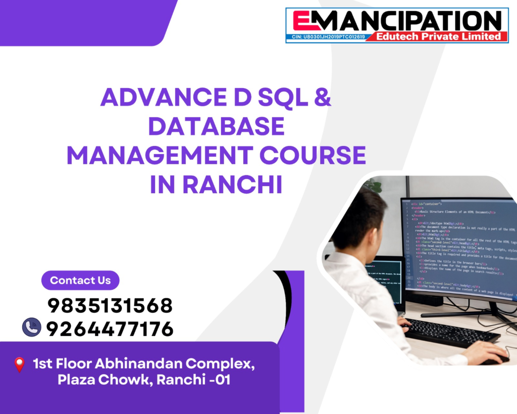 Students in Ranchi who want to develop advanced database skills can benefit from professional training at Emancipation. The Advanced SQL & Database Management course is designed to provide both theoretical knowledge and practical experience.
